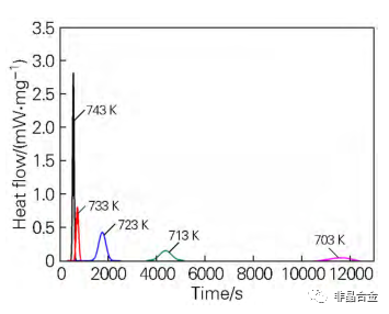 图2为Zr48Cu36Ag8Al8非晶合金在过冷液相区内不同温度(703~743K)的等温DSC曲线。可以看出,不同温度的等温DSC曲线均先经历一段孕育期,然后向晶化态进行转变。孕育时间与等温晶化时间随着退火温度升高而缩短,说明非晶合金内部原子的移动性随着温度的升高而增加,内部微结构波动增大,使其更容易向晶化态进行转变。通过计算发现在不同温度下获得的晶化焓基本相同,说明该合金的晶化反应遵循典型的形核-长大模式。根据DSC曲线)可以获得晶化体积分数α: