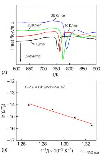 式中,C为常数;β为加热速率;Ex为晶化激活能;R为气体常数;Tp为DSC曲线上任意峰的放热量最大处所对应的温度,不同的加热速率β对应不同的Tp值。通过绘制ln(β/Tp2)-1/Tp图并进行线性拟合,其直线斜率即为表观晶化激活能。根据DSC曲线提供的特征温度,获得Kissinger曲线(b)所示。利用该图得到的晶化激活能约为239kJ/mol。