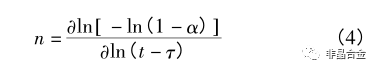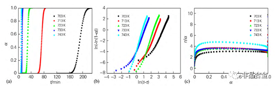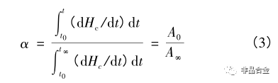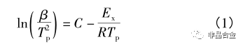 无论是等温或非等温过程,扩散型固态相变均是由形核、生长共同控制的。当原子获得一定能量时,非晶合金将向稳定的晶体相进行转变。经典JMA模型能够成功用于描述由形核、生长控制的各种固态相变过程,如式(2)。因此,该模型也可以用于分析非晶合金的晶化动力学。
