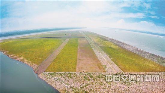 千公里之外的湖北鄂州,正在扎实推进戴家洲水道整治工程。50年不腐烂的无纺布上,拴满了30公斤重的水泥预制块,被专用铺排施工船沉放到江底,控制住水中“流动的沙丘”,稳固河床。江底“铺地砖”、滩上重建植被、岸上生态结构防护,施工现场呈现出热火朝天的立体施工图景。