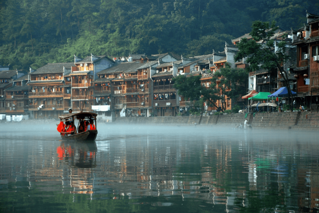 早餐后,我们坐上小小的乌篷船,开始了清晨的【沱江泛舟】。看粼粼的水纹在面前徐徐荡开,听若有若无的歌声在远处渺渺响起,我们的心境也渐渐从喧嚣中走出来,变得像沱江一样平静安稳。沱江水静静地流淌着,很浅,很多地方半篙既能落底,但清澈透明,可以清楚地看到水底的游鱼,还有那些飘摇着的长长水草。沱江两旁,是有着百年历史的吊脚楼,最让人上心的是隐在一丛绿树中细脚伶仃的吊脚楼,它会让人不由想起久远,想起沈从文笔下的《边城》,想起翠翠在茶洞的渡口边对着水面无止境的凝望和等待......