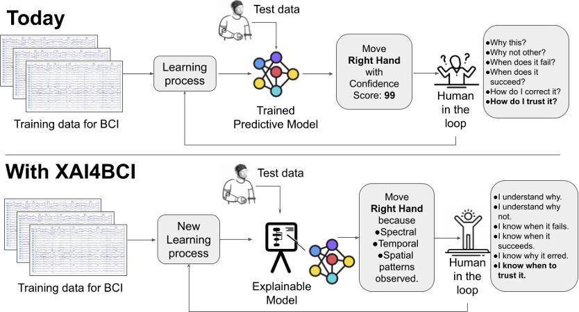 为解决这个问题,印度理工学院Yogesh Kumar Meena领衔的研究团队提出了一种新的思路:应用于脑机接口的可解释人工智能技术(XAI4BCI)。他们试图将人工智能的解释能力与大脑信号结合,让我们能更直观地理解脑机接口,让这门技术不再是科学家的专属,而是融入每个人的生活。