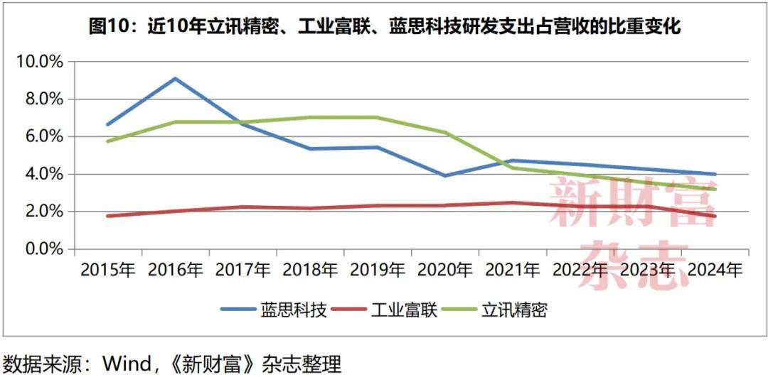 但是,随着立讯精密营收大幅增长,其研发支出占总营收的比重(创新投入指标)开始下降,2024年降至3.2%(图9)。横向对比立讯精密与工业富联、蓝思科技等同行的创新投入指标,立讯精密在2017年至2021年为三家中最高,2022年开始略低于蓝思科技(图10)。