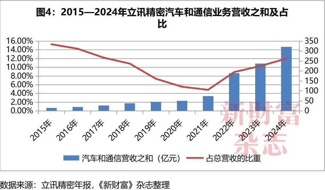 2015—2024年,其通信和汽车两大业务营收逐年攀高,2023年均超过100亿元。2024年,这两大业务营收合计达到321.2亿元,是2015年营收之和15.45亿元的20.8倍(图4),并超过2018年消费电子业务的营收,相当于立讯精密成功再造了一个立讯精密。