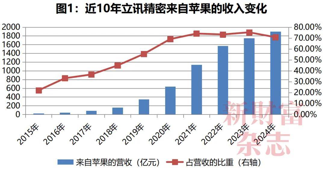其消费电子板块中,来自苹果的业务占营收大头。2015—2024年,立讯精密来自苹果的营收从22.39亿元增至1901.39亿元,10年增长84倍,占其总营收的比重由22%上升至70%以上,2023年占比最高达到75.24%(图1),2024年创历史新高,达到1901亿元,立讯精密也成为苹果前五大供应商之一。