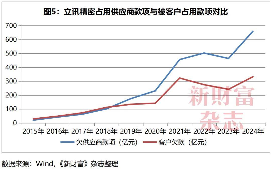 2015—2018年,立讯精密来自客户的欠款大于其对供应商的欠款,差额介于6.05亿元至10.4亿元之间。但2019年之后,立讯精密占用供应商款项的规模快速增长,与被客户欠款规模形成的“剪刀差”越来越大,这一差额在2024年创阶段性新高,达到326.7亿元(图5)。