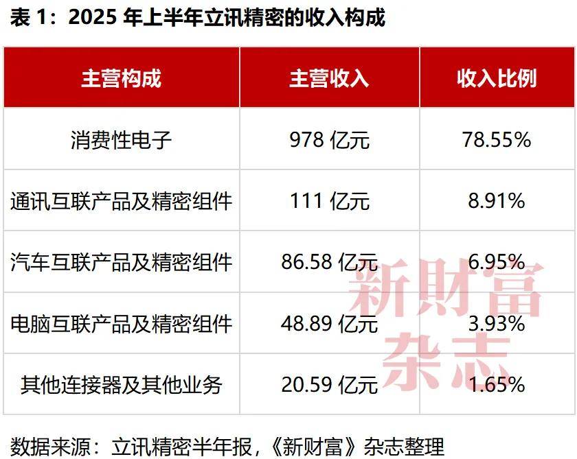 立讯精密的收入来自五大板块,包括消费电子、通讯互联产品及精密组件、汽车互联产品及精密组件、电脑互联产品及精密组件、其他连接器及其他业务,其中,消费电子是其核心主业,贡献营收占比近八成(表1)。