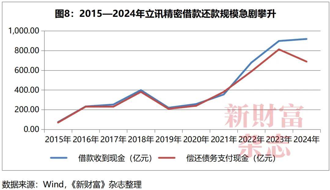 2015—2024年,立讯精密筹资现金规模从76.35亿元增长至1008.74亿元。筹资结构中,借款占大头,2024年,其借款金额达917.09亿元,为上市后的最高值。