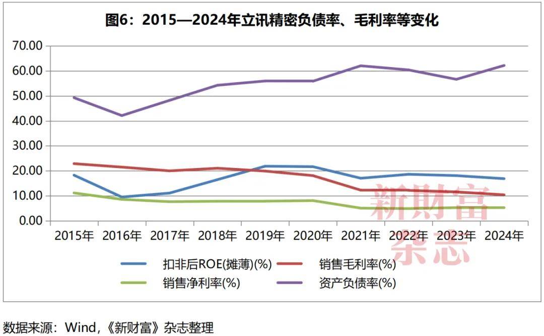 2021年之前,立讯精密的资产负债率多年维持在60%甚至50%之下,但2021年至2024年则上升至62%。