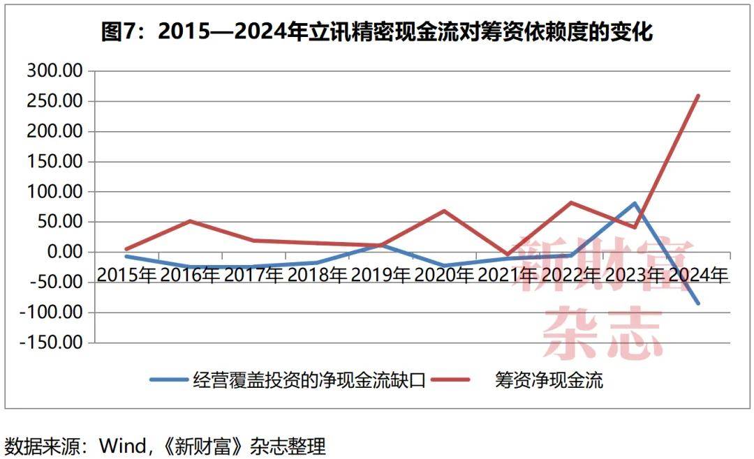 2015—2024年,立讯精密的投资现金支出从31亿元攀升至969.13亿元,2024年投资净流出356.56亿元,经营净现金流已无法覆盖投资支出。二者缺口逐年加大,立讯精密需要越来越多的筹资来补足现金流的缺口(图7)。