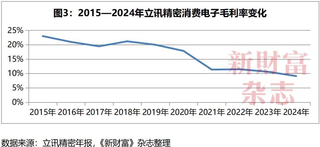 除了被消费电子产业及苹果减速拖拽之外,立讯精密从零部件向整机代工的业务延伸,产品结构变化不可忽视的另一面,是毛利率的下降。其消费电子板块的毛利率从2015年的23%,节节下降至2024年的9.1%(图3)。