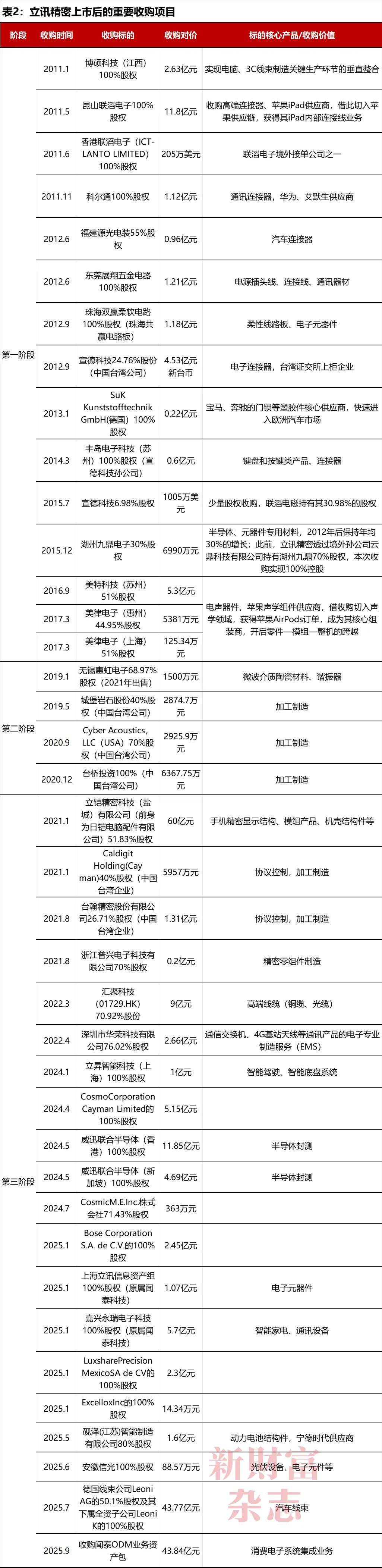 2010年在A股上市后,2011年,立讯精密即开启了长达14年的连续收购。据《新财富》杂志统计,过去14年间,其重要收购项目有39起,耗资超过227亿元,堪称A股“并购大王”(表2)。