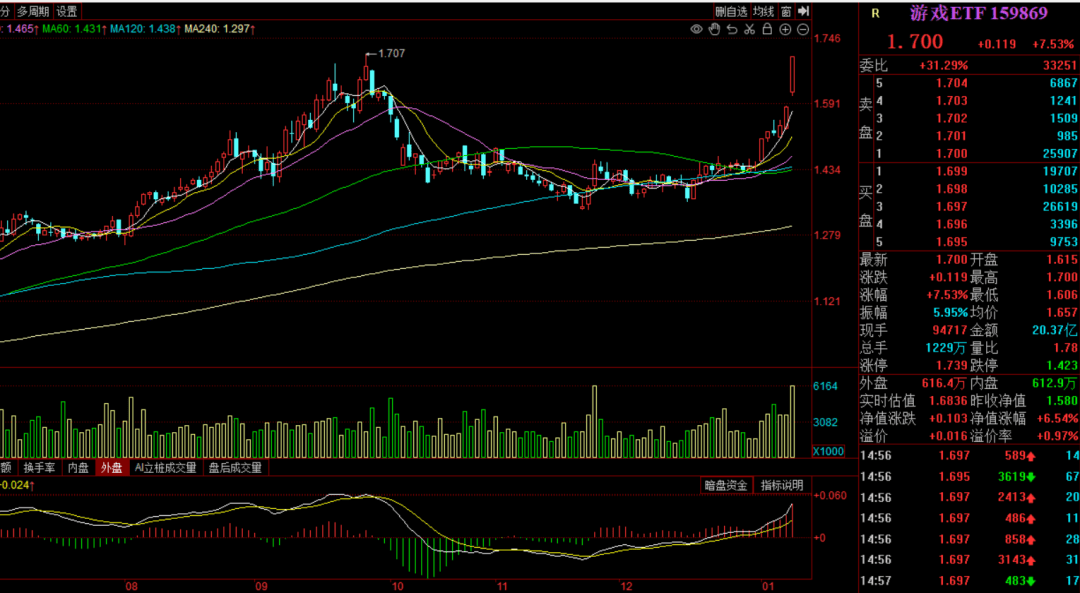 大面积扩散的,还是AI应用,多个子概念都可以用它概括、比如小红书、快手、文生图、数字媒体等,另外还有游戏游戏确实受益于AI技术,且业绩明显改善,今天游戏ETF大涨7.53%,回踩半年线后再次拉升,马上就要创新高了