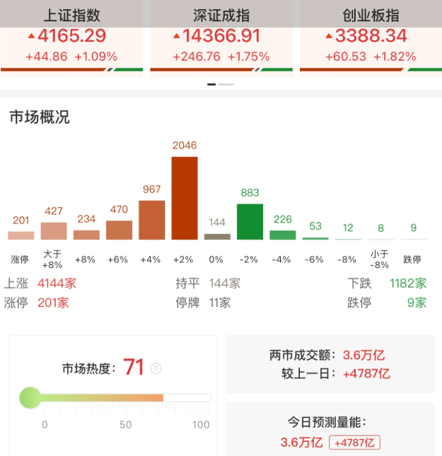 盘面上,市场热点轮番活跃,全市场超4100只个股上涨,其中201只个股涨停。从板块来看,AI应用概念全线板,利欧股份、美年健康、天下秀、省广集团2连板,卫宁健康、新点软件、福昕软件等多股涨停。