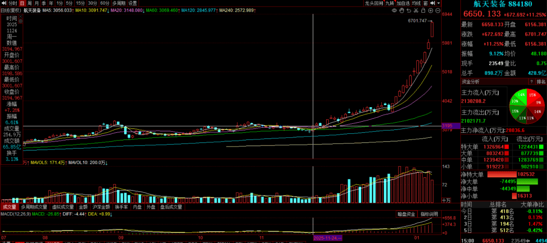 航天装备板块高位再次加速,今天涨了11.25%,就算是主线行情,如此毫不休息的涨法,