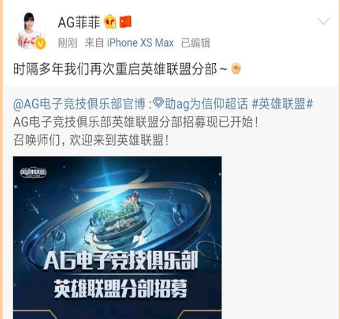 在9月15日时,AG俱乐部的官博已经发布出了一条公告,就是即将成立英雄联盟分部,并且已经在招收职业选手了,这也说明PDD和AG的合作应该更多的是股份方面的合作,YM的选手能不能被引入AG也是一个未知数,但是如果两家真的合作了,作为“电竞黄埔军校校长”的PDD,为AG俱乐部的英雄联盟分部输入一些新鲜血液也不是不可能的。